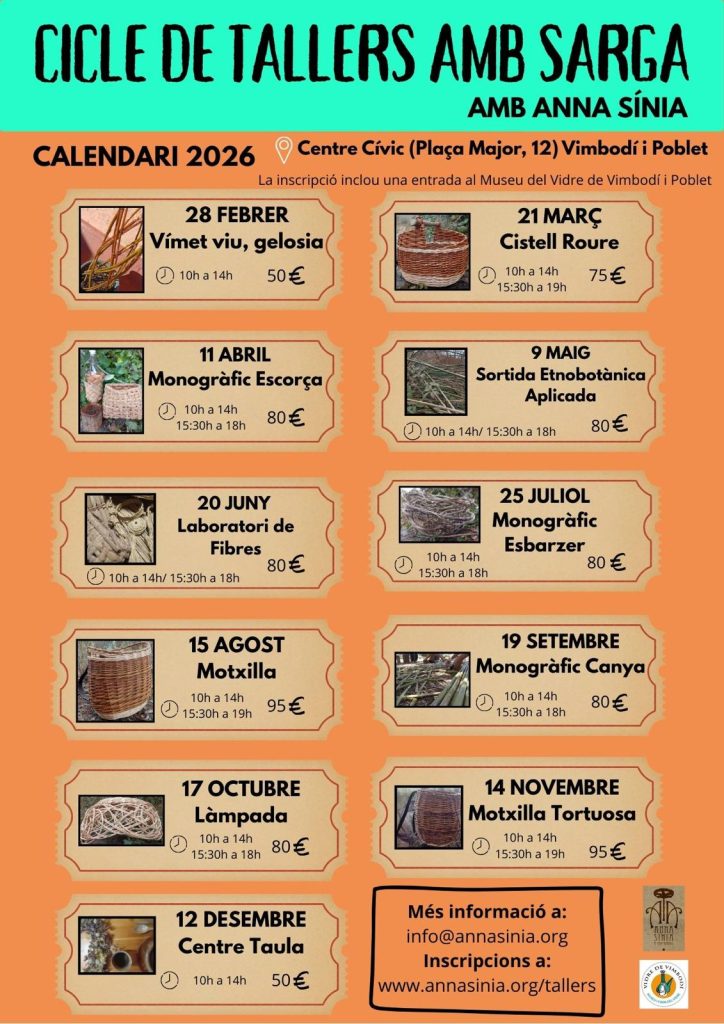Aquest és el calendari anual on podràs trobar una gran varietat de tallers de cistelleria que faig a Vimbodí cada mes.